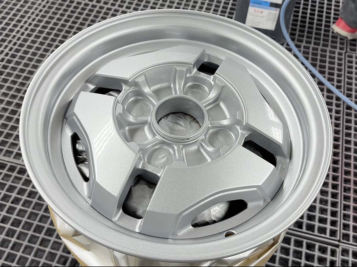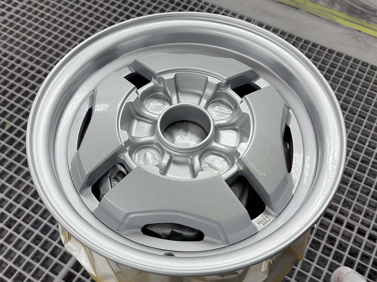 まずはホイールの塗装です。ホイールは経年劣化で塗装がヤレた状態で、かつホイールのセンターキャップは塗装が完全に剥がれ、下地の樹脂がむき出しになっていて、40年の古さを引き立てていましたので、しっかりとキレイにしていきたいと思います。