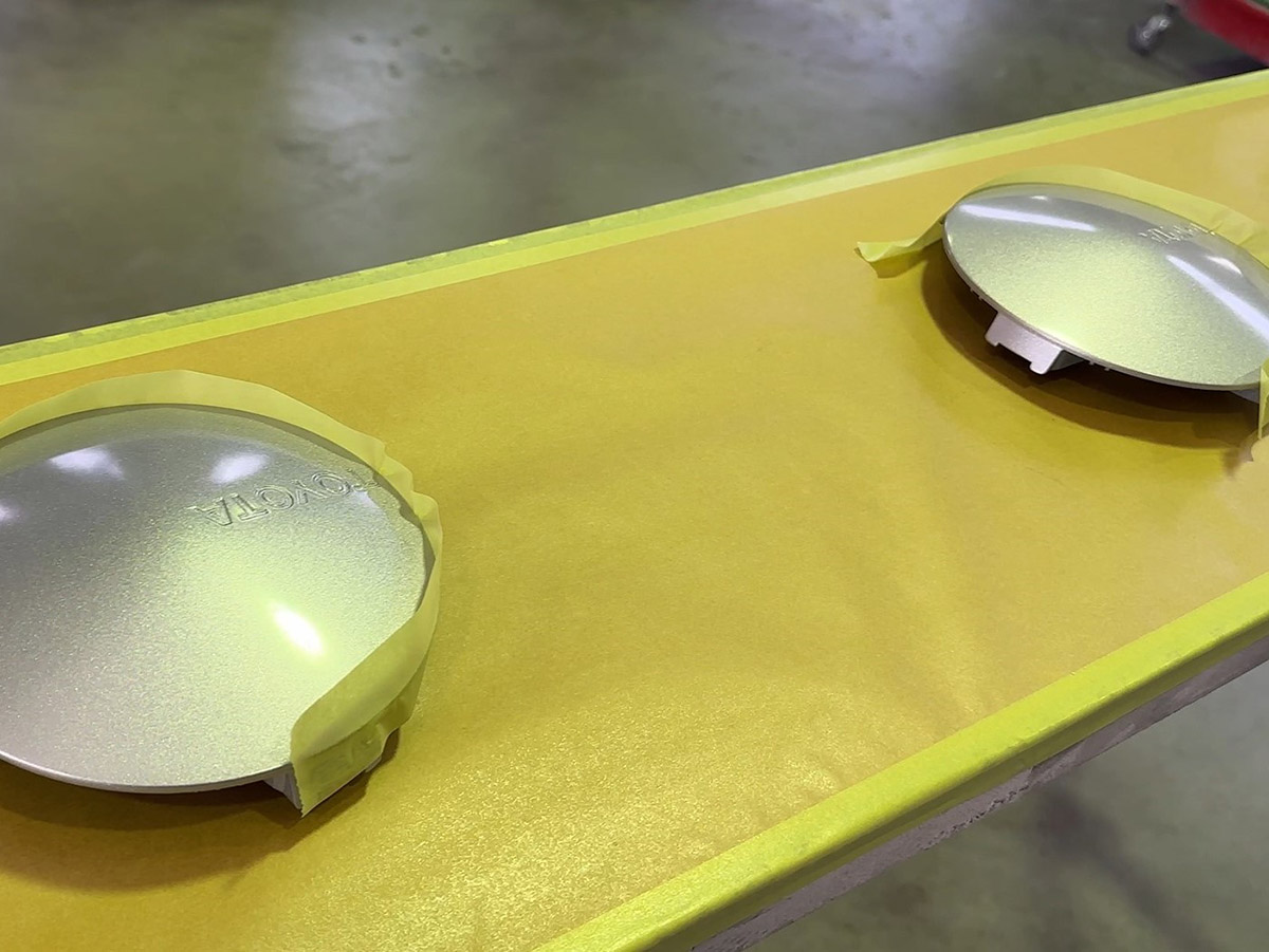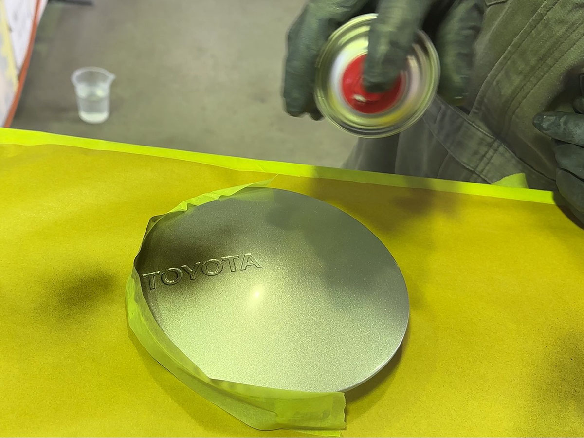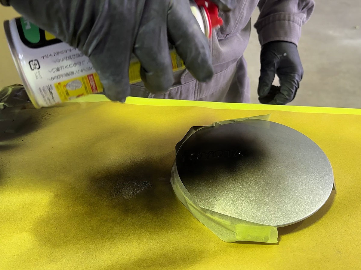 センターキャップの「TOYOTA」ロゴにブラックの塗装を行っていきます。