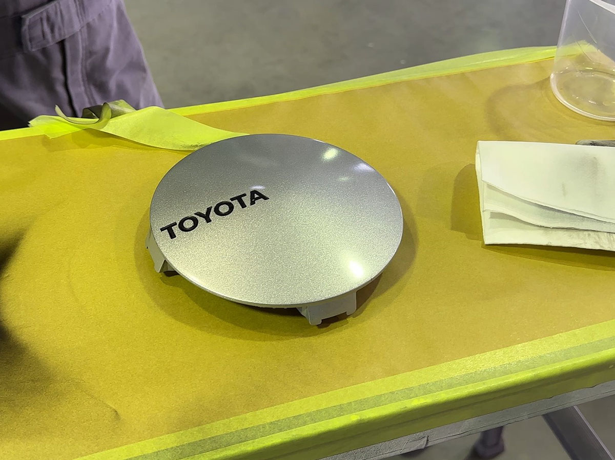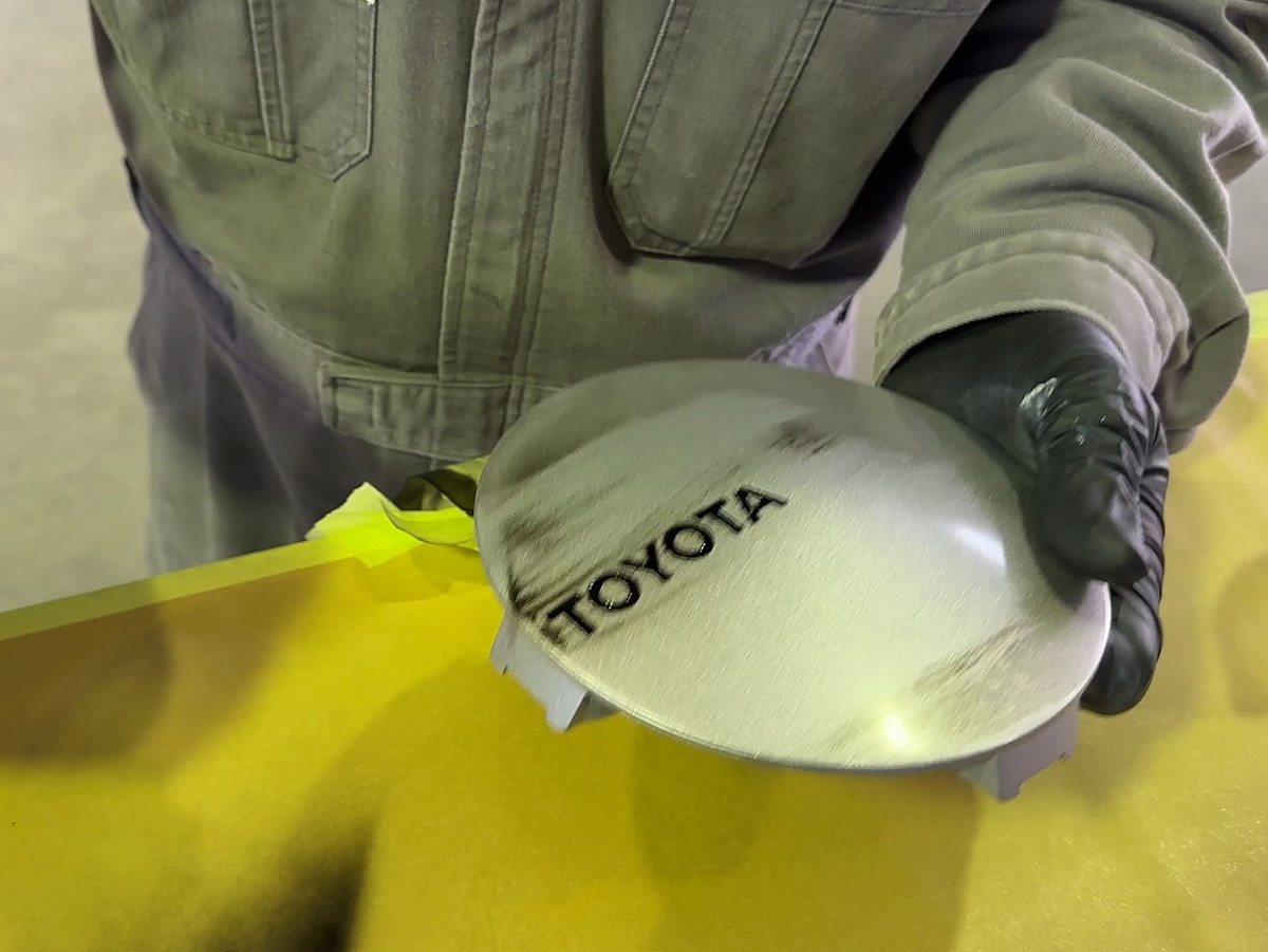 見事表面についたブラックだけが除去され、黒に塗装された「TOYOTA」のロゴが浮かび上がりました。