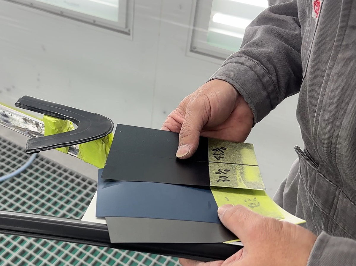 元の黒塗装を見て、ボディに塗装したブラックをベースに、艶消し用クリアーの割合を調整したものでカラーを合わせて、ある程度近い黒を選択します。