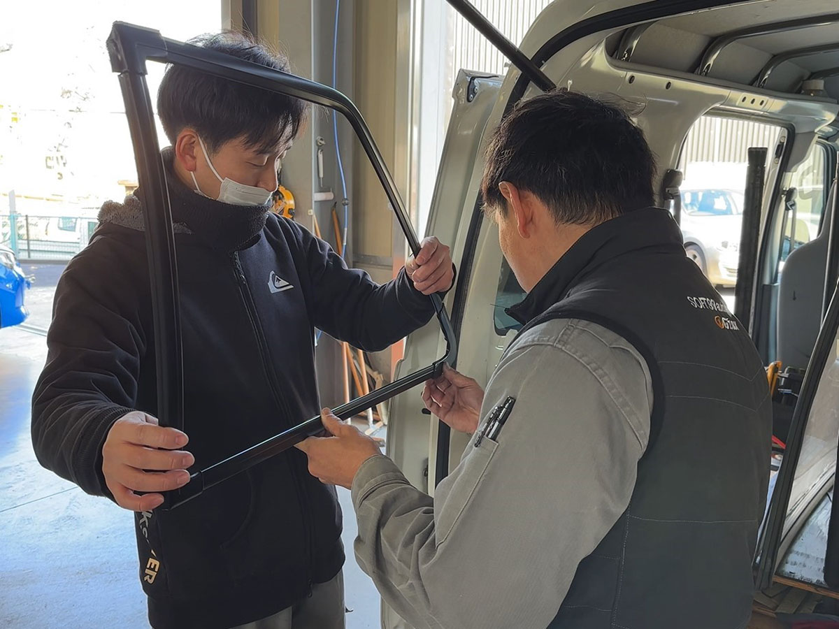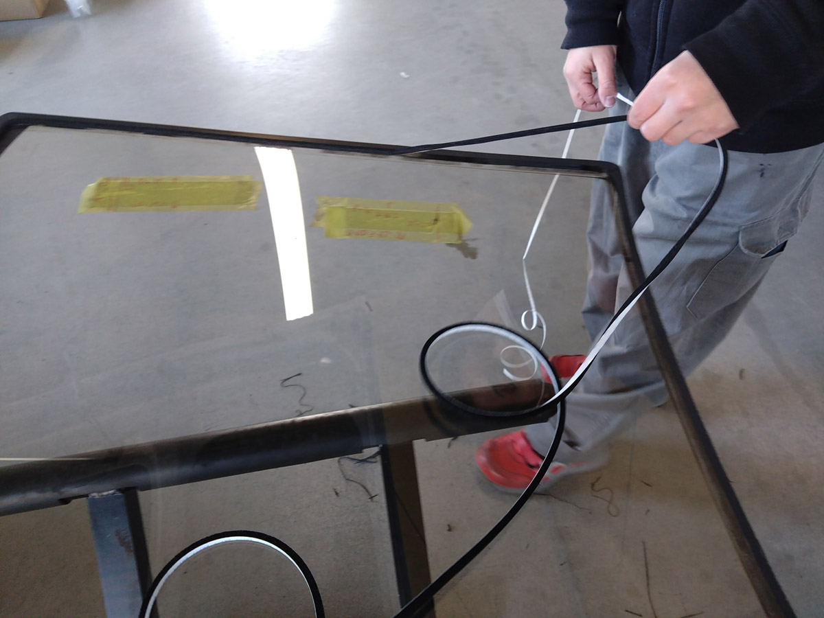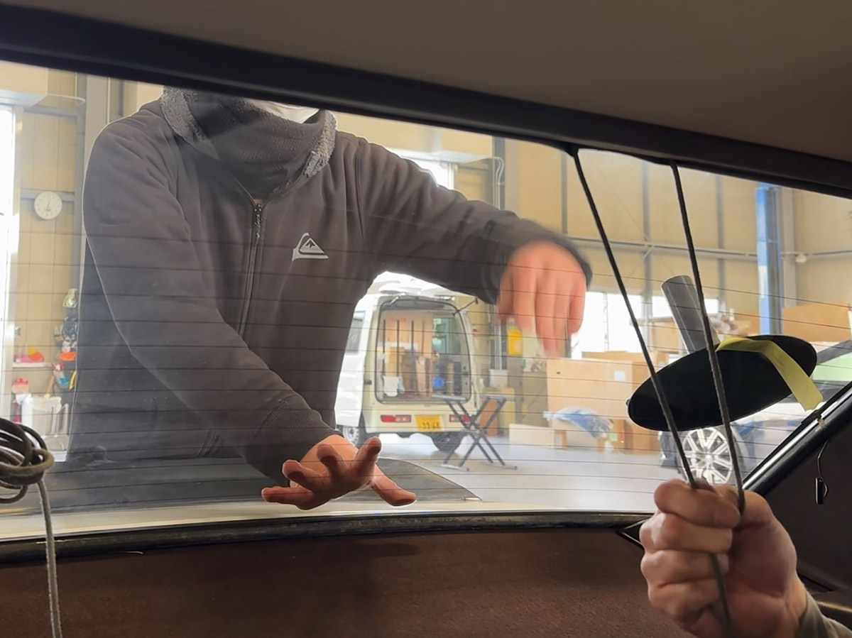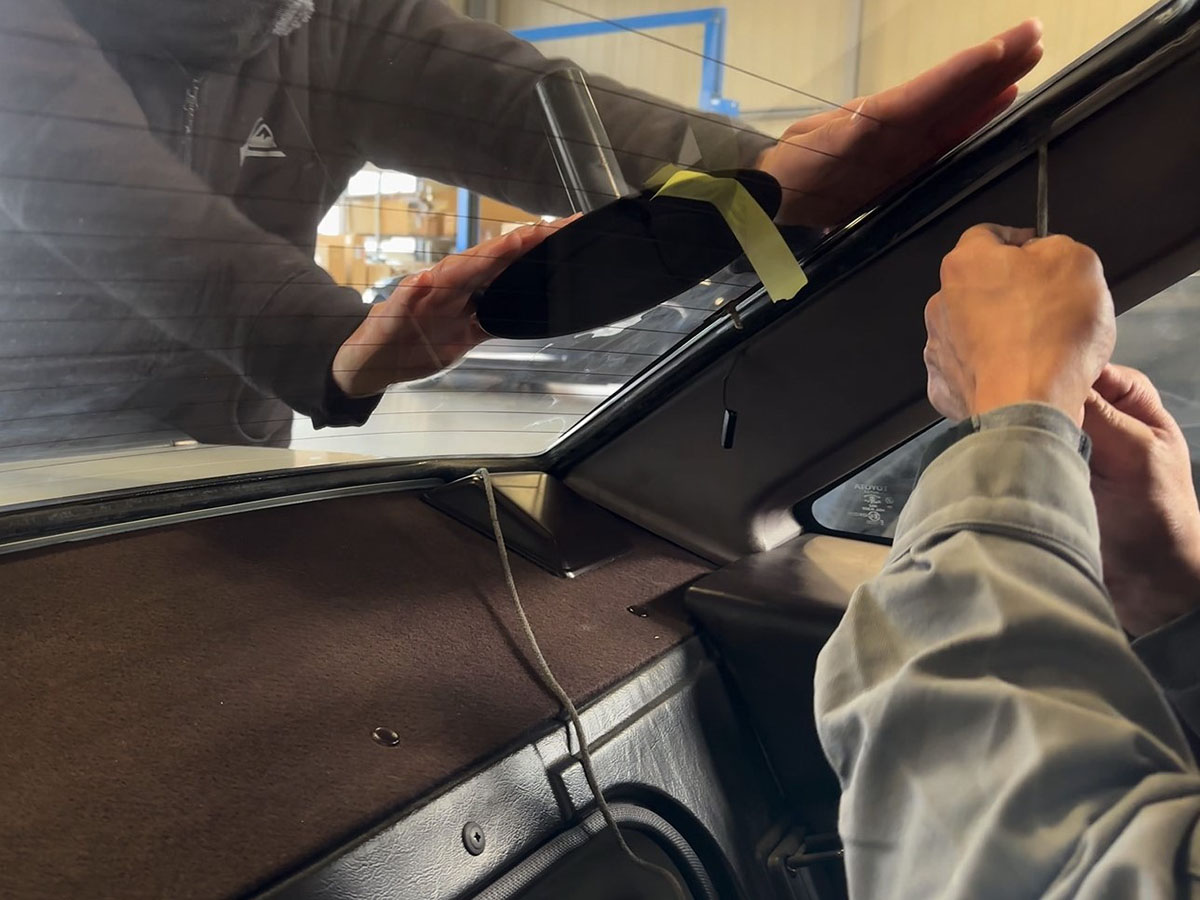 内外一体化しているリアガラスのウェザーストリップを、紐を利用して内側から引っ張ることで密封して取り付けていきます。