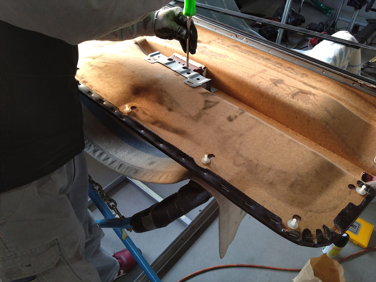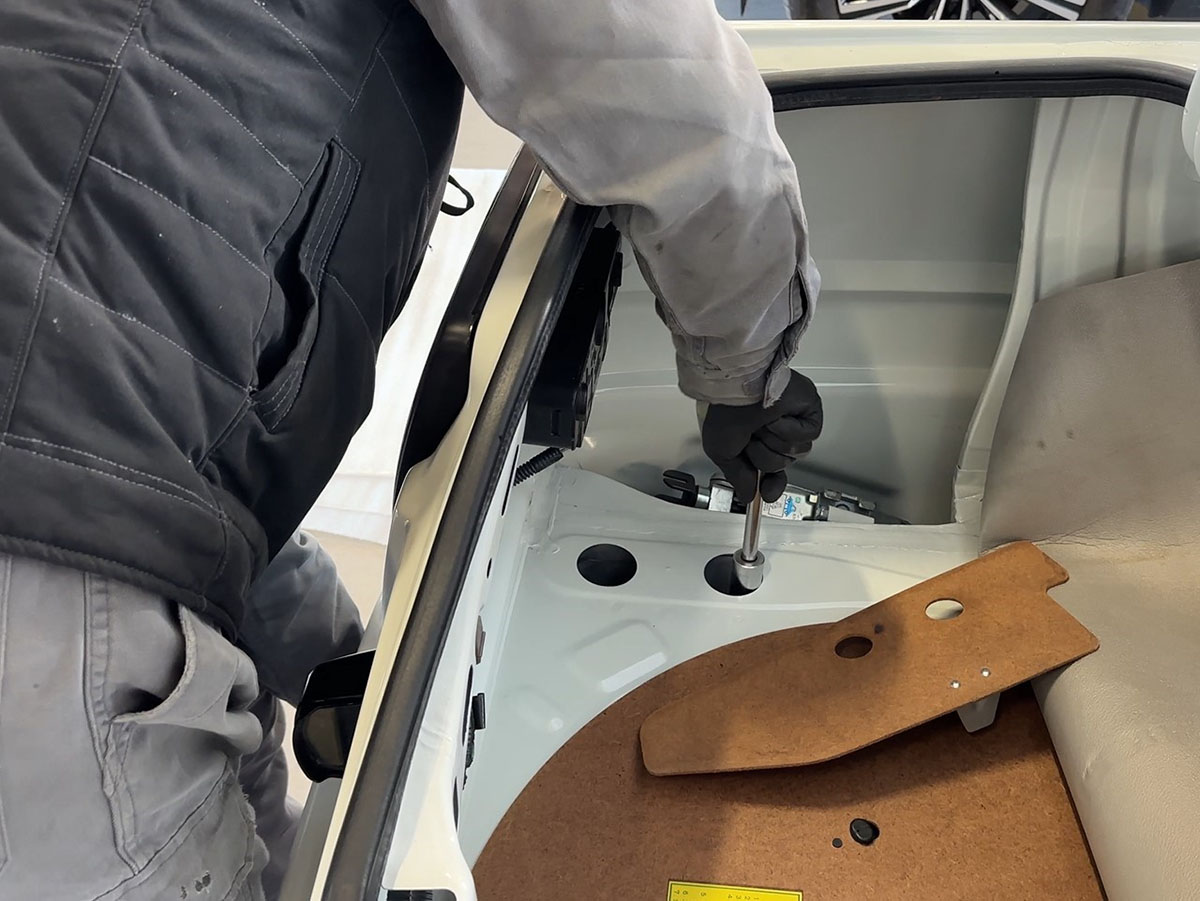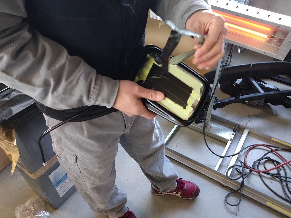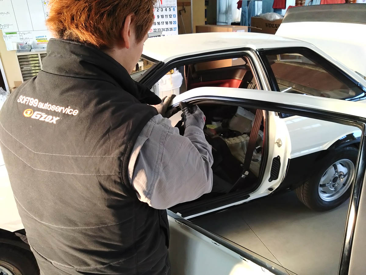 内外一体化しているリアガラスのウェザーストリップを、紐を利用して内側から引っ張ることで密封して取り付けていきます。