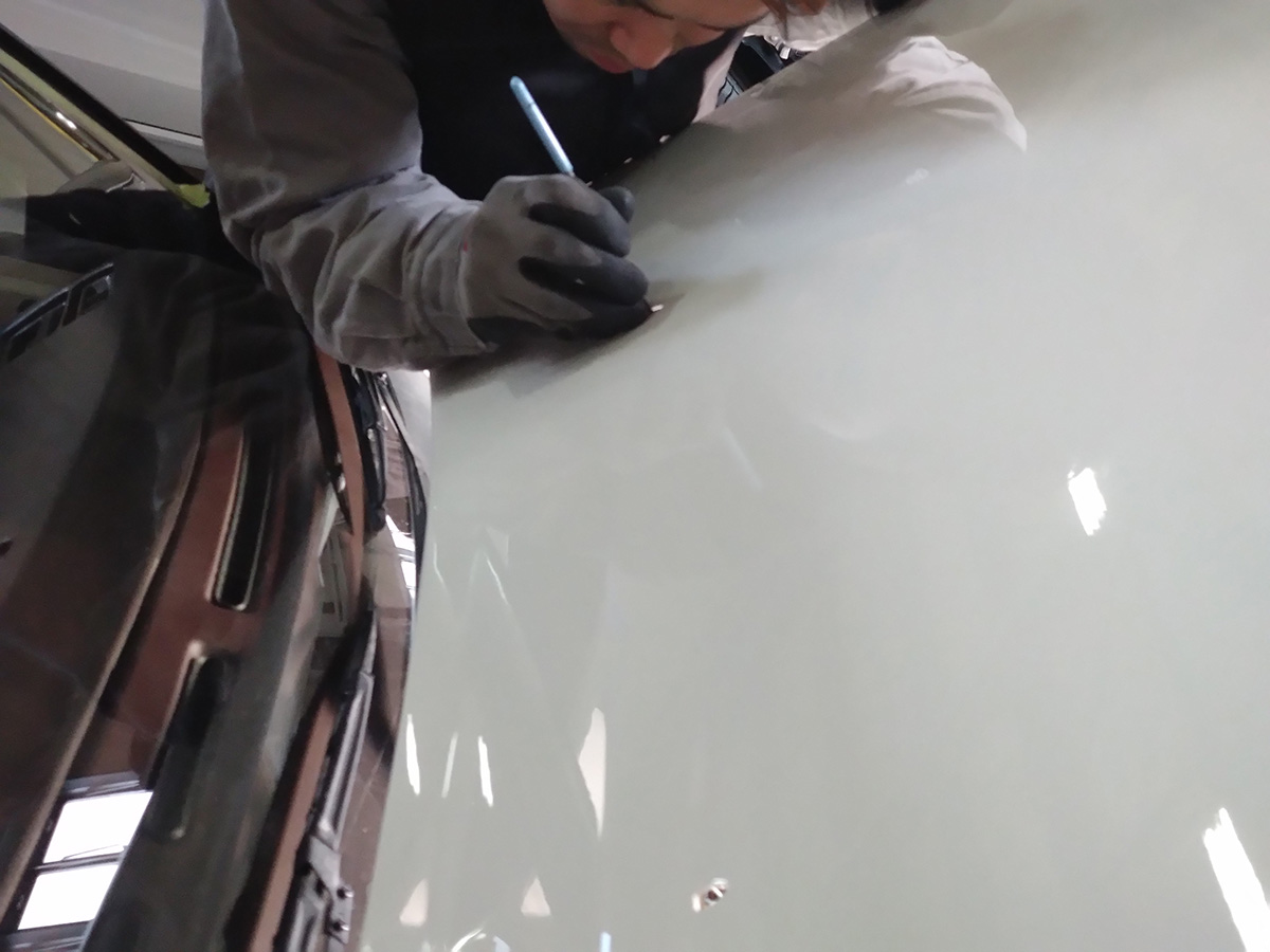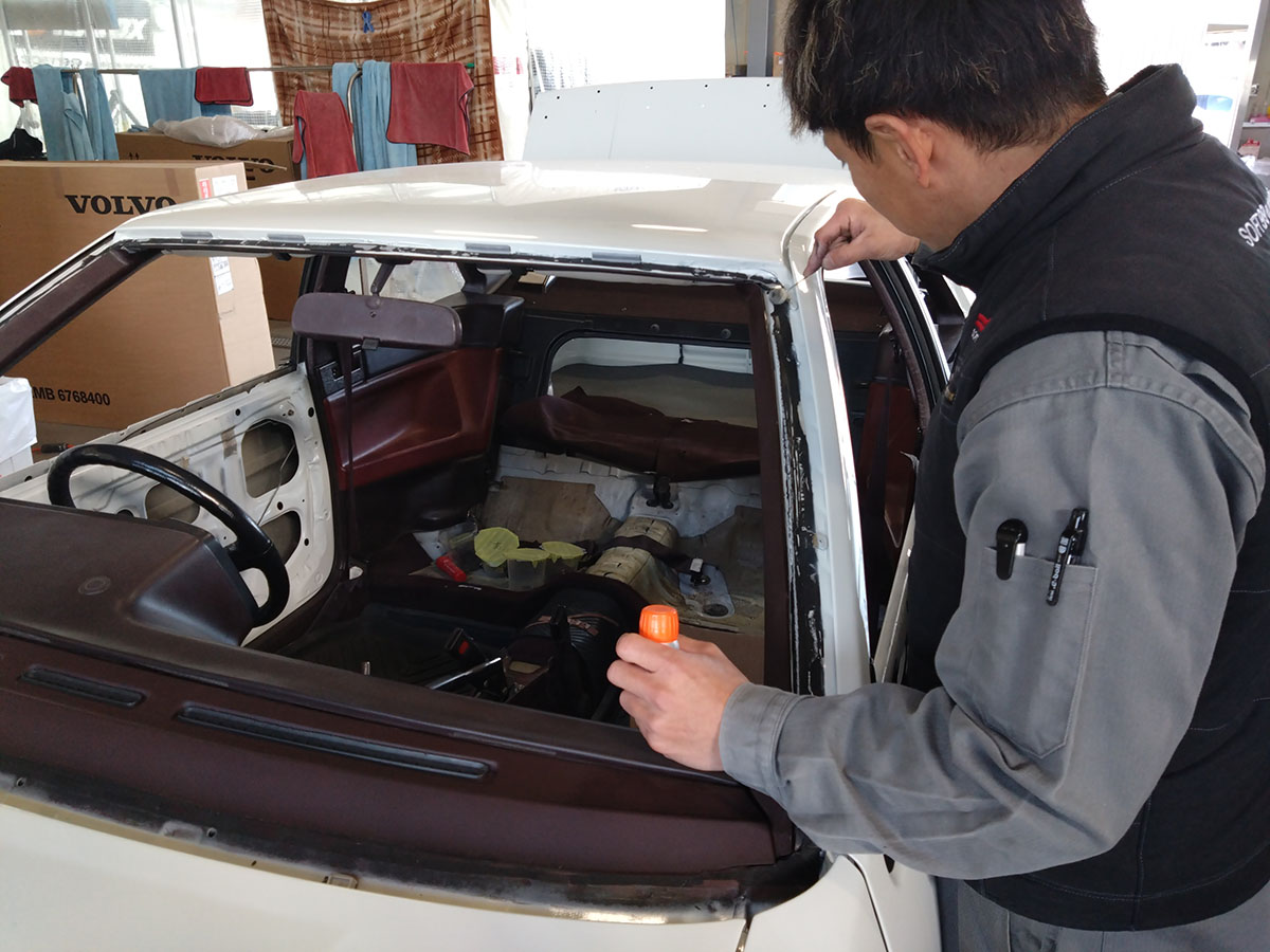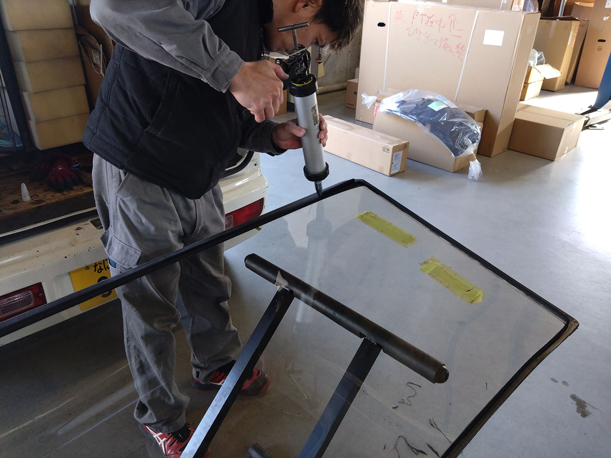 まずはフロントガラスから。プライマーや接着剤を段取りし