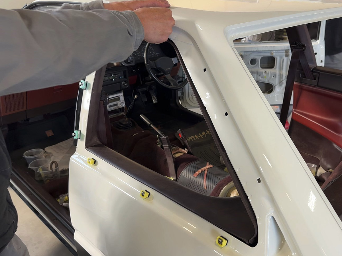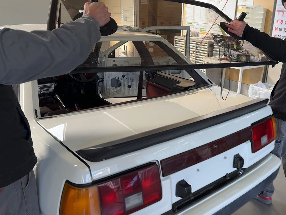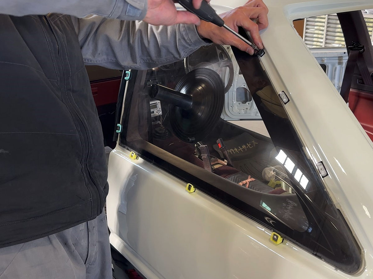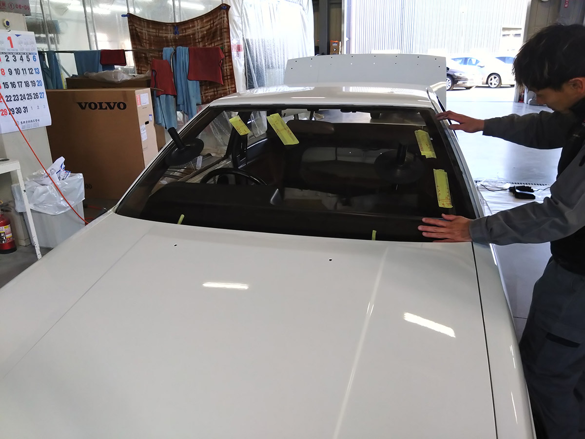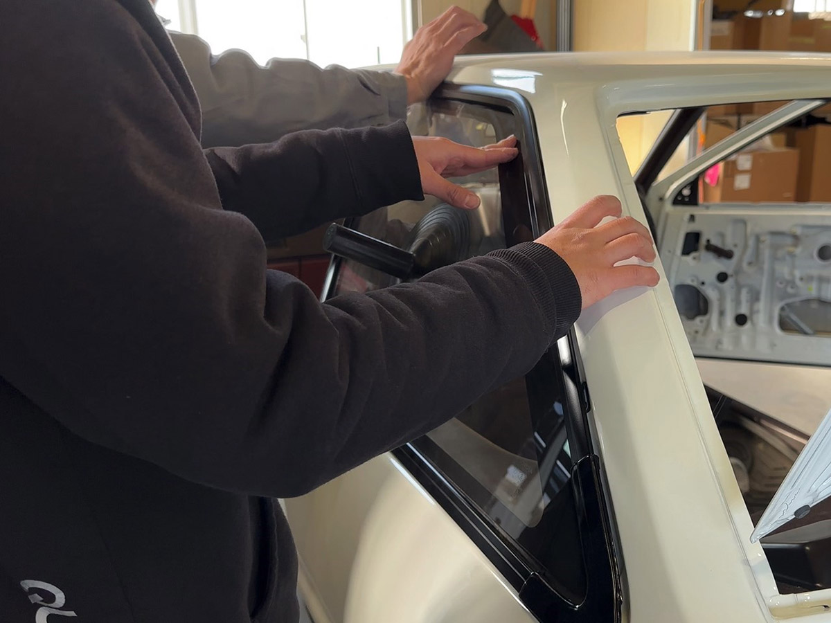 左右のクォーターガラスとモールの取り付けが終わりましたら最後はリアガラス