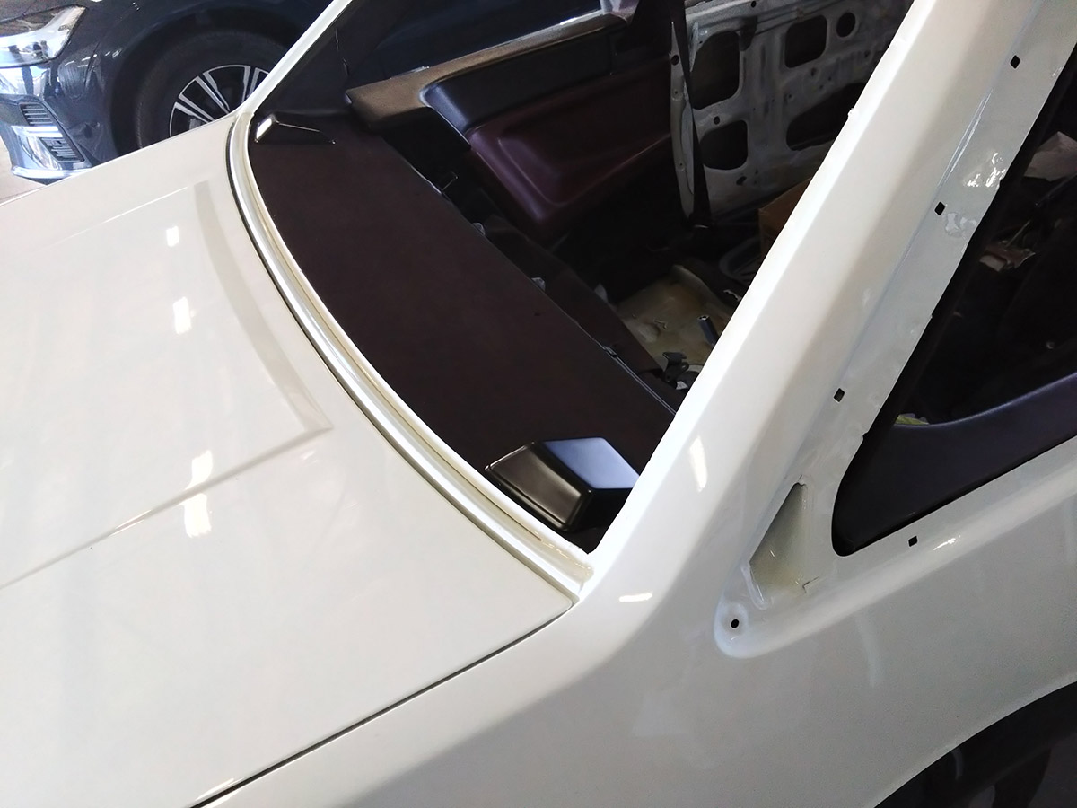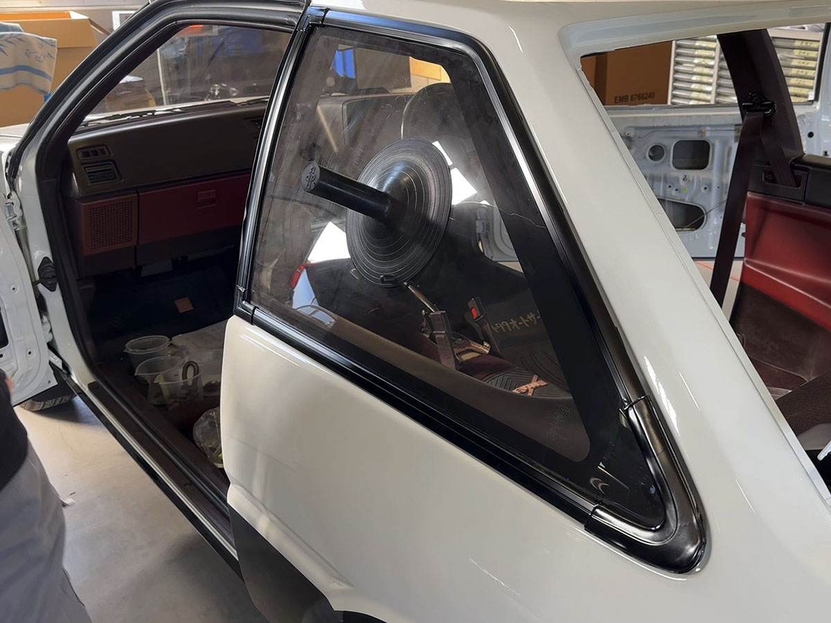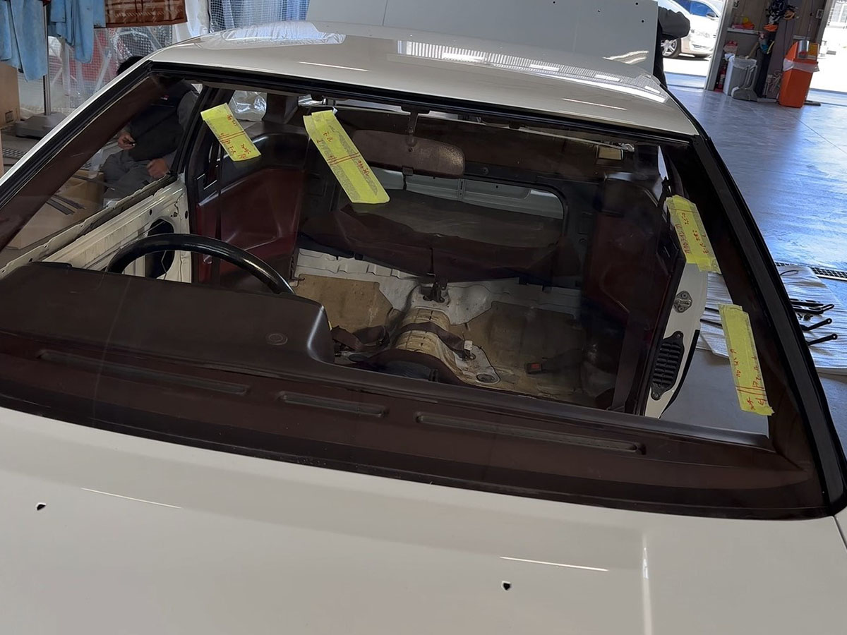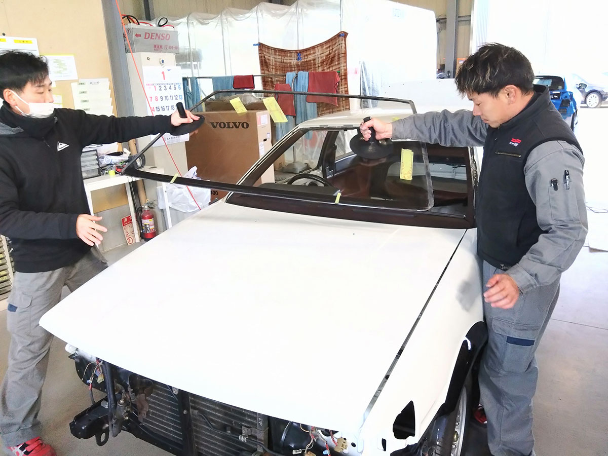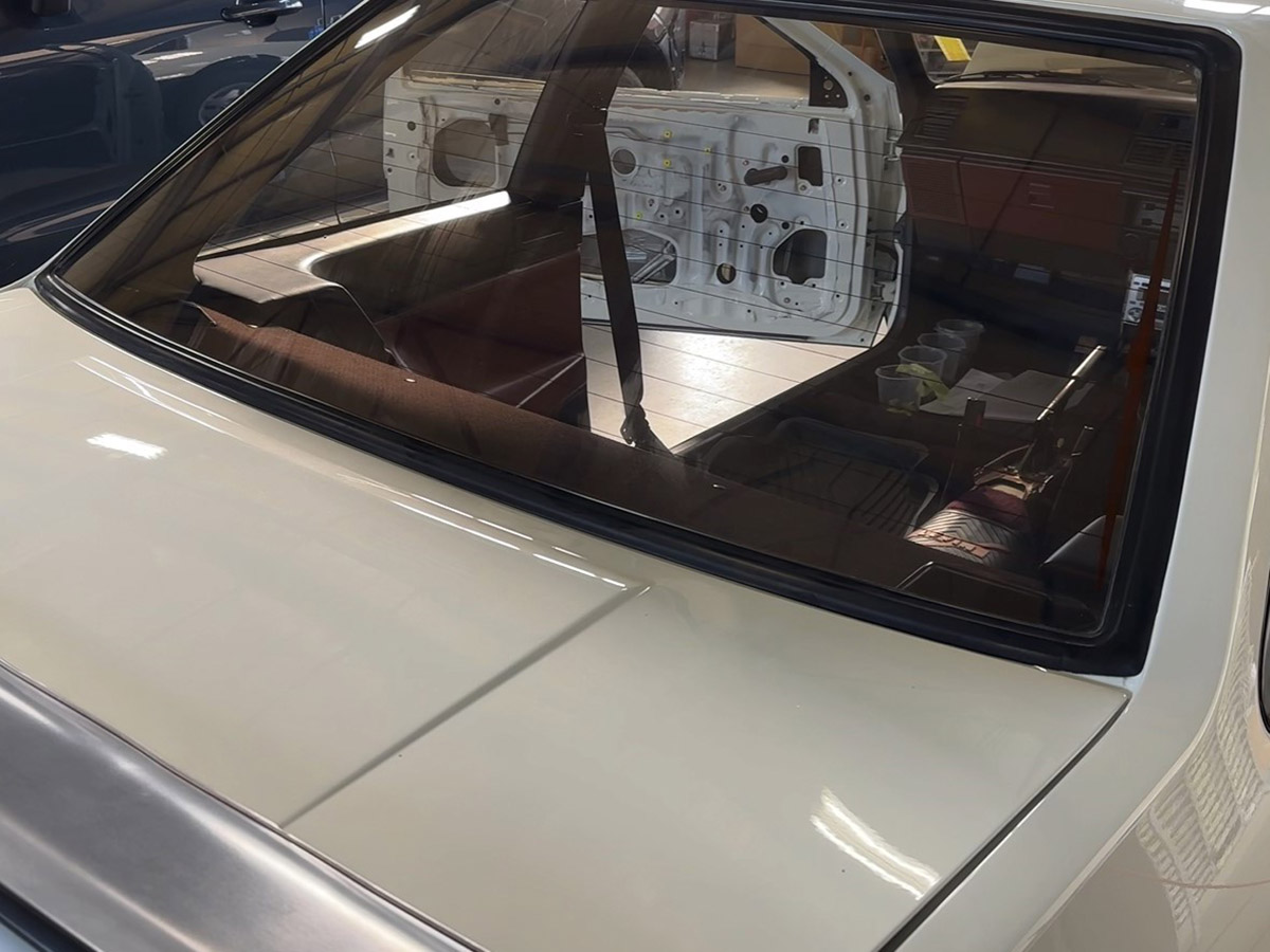 左右のクォーターガラスとモールの取り付けが終わりましたら最後はリアガラス