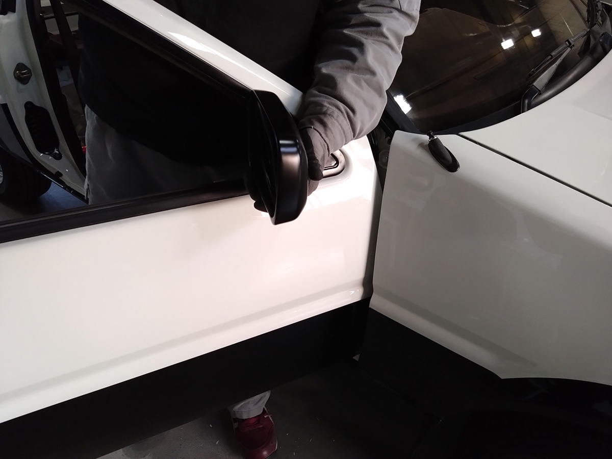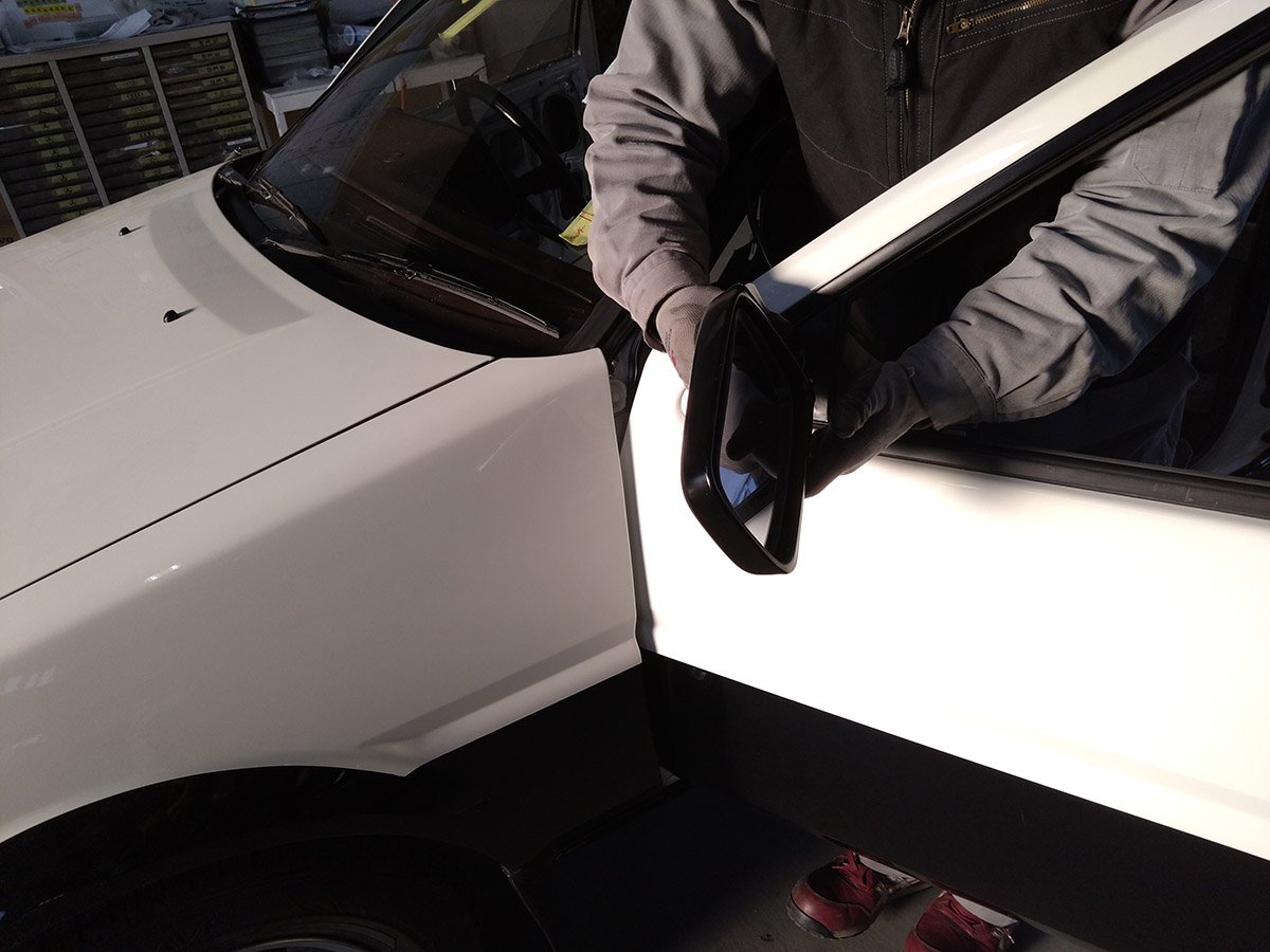 塗り直して黒艶が復活したミラーと、塗り忘れていたモールとともに取り付けていきます。