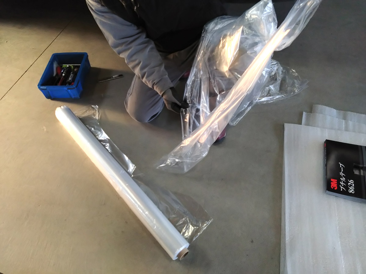 すでに純正の防水シートはありませんので、ブチルテープとビニールでオリジナルのものを作っていきます。