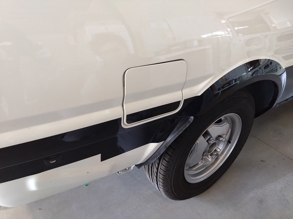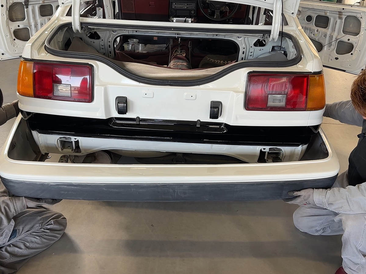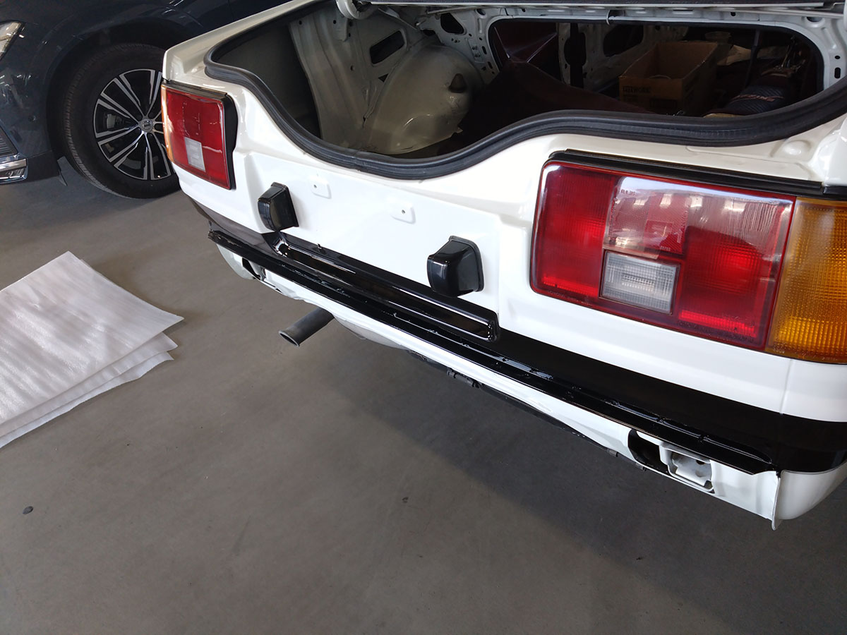 塗装前は素地がうっすら見えていて古さを醸し出していたものの、見違えるようにキレイになったリアバンパーを取り付けたら、