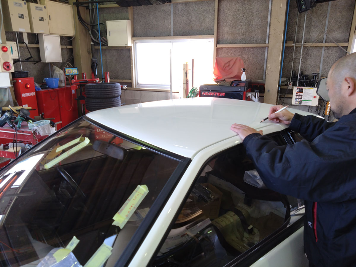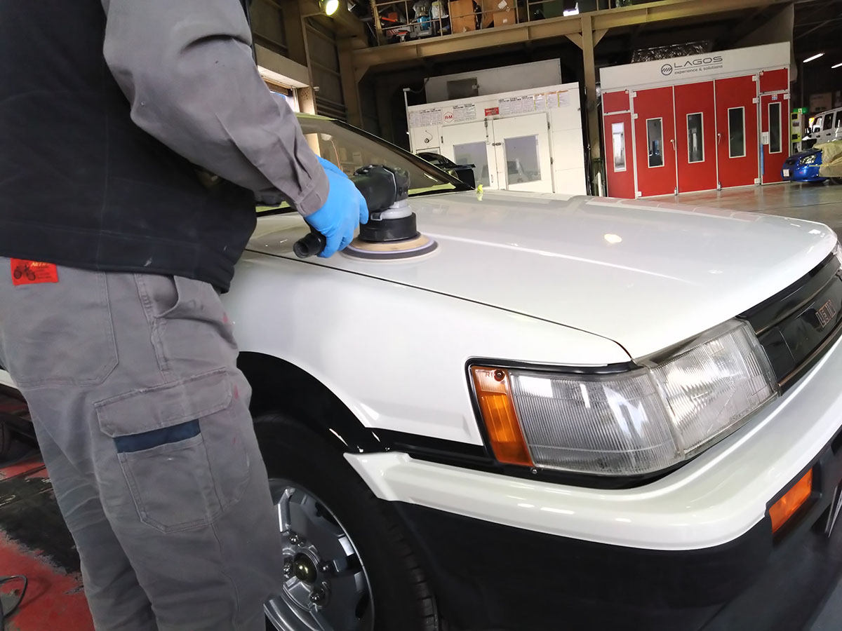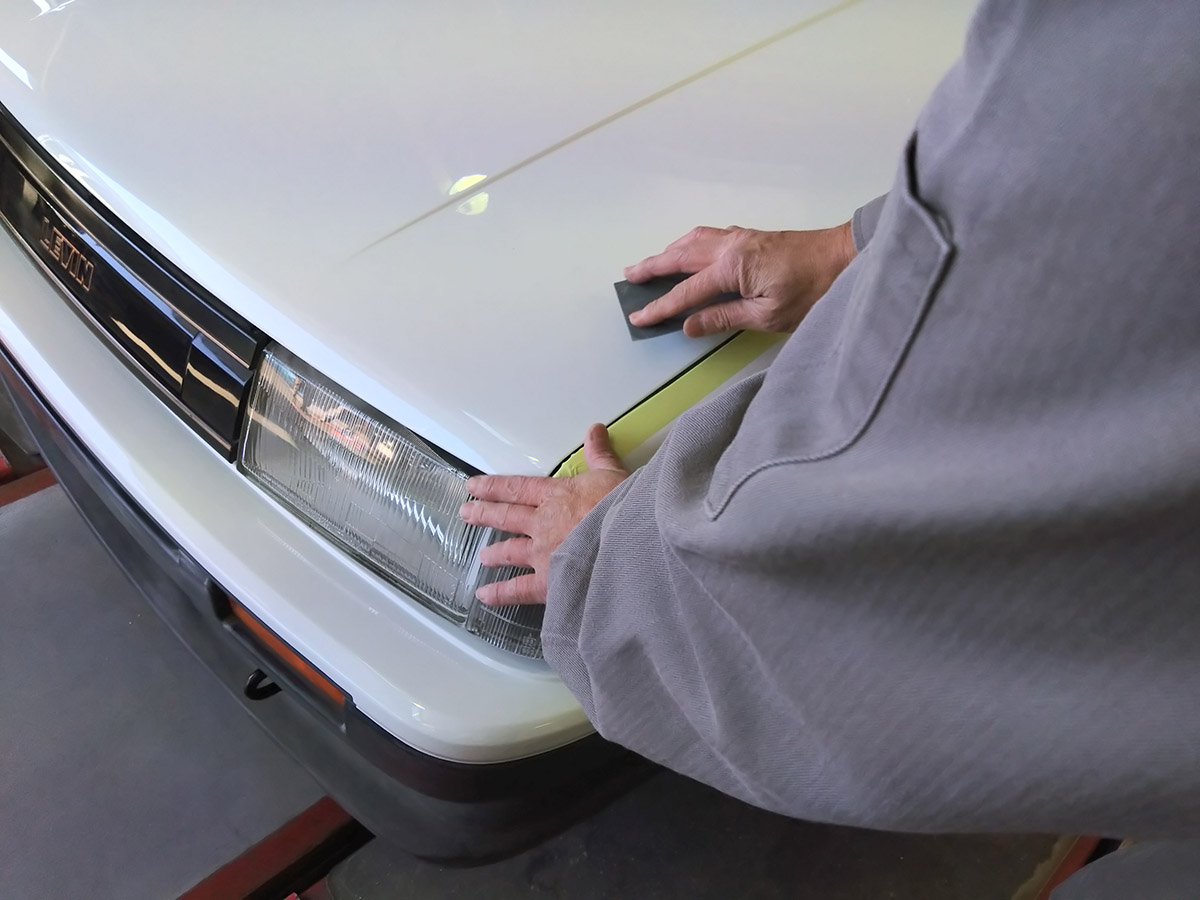 ハイテックツートンに全塗装されキレイになった「トヨタ AE86(ハチロク)」ですが、塗膜表面は塗料が平滑になっていない状態で、ところどころ異物の付着や塗料のダマなどもある状況ですので、これらを均一に仕上げていきます。