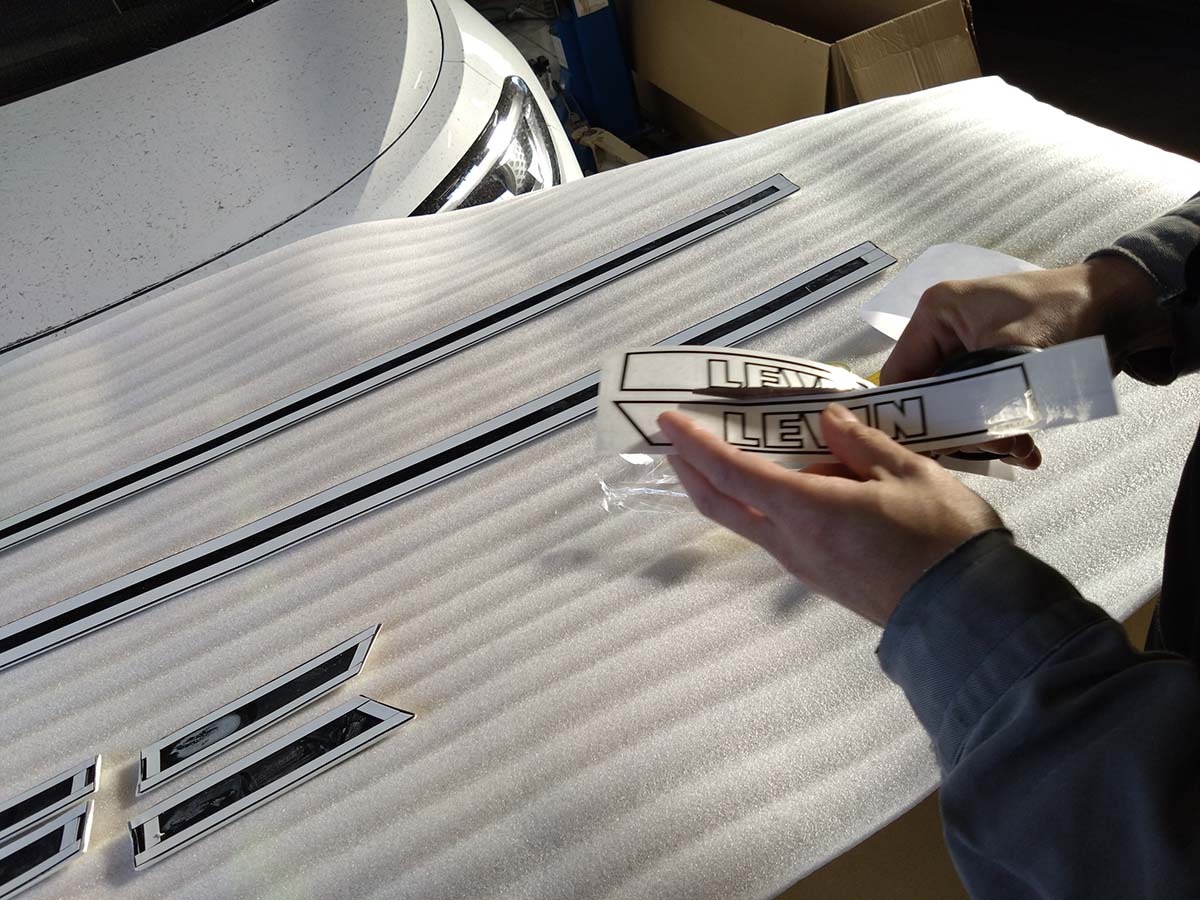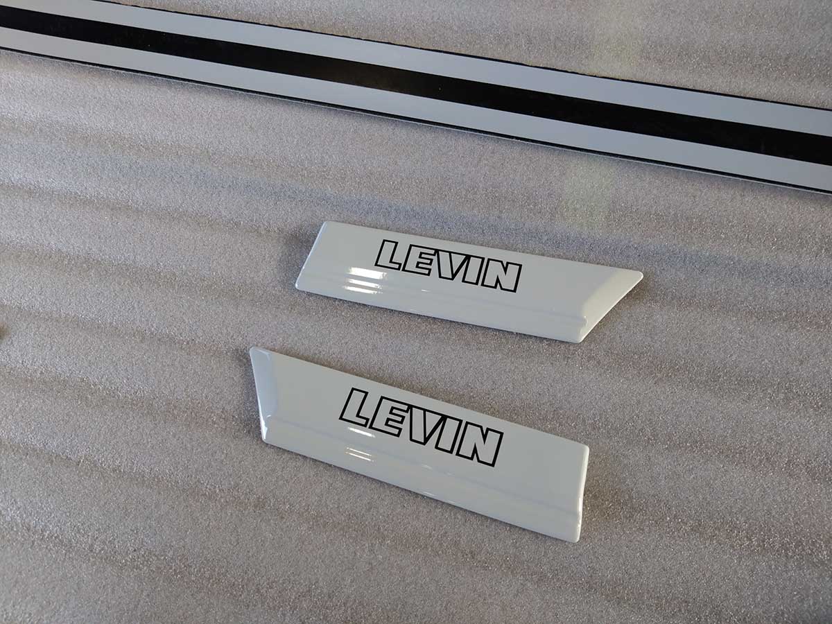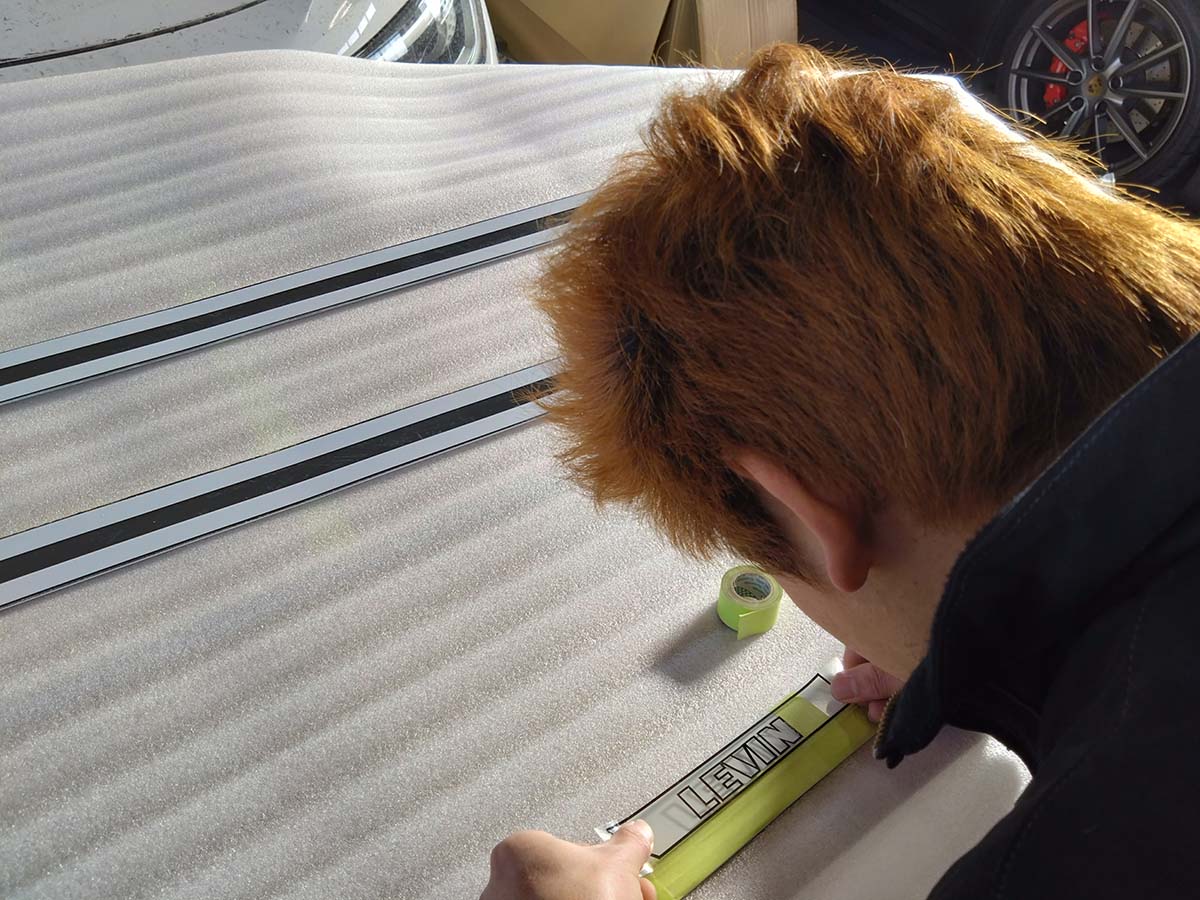 塗装してキレイになったドアモールは、裏面に両面テープが準備済み、表面に「LEVIN」ロゴのステッカーを貼っていきます。