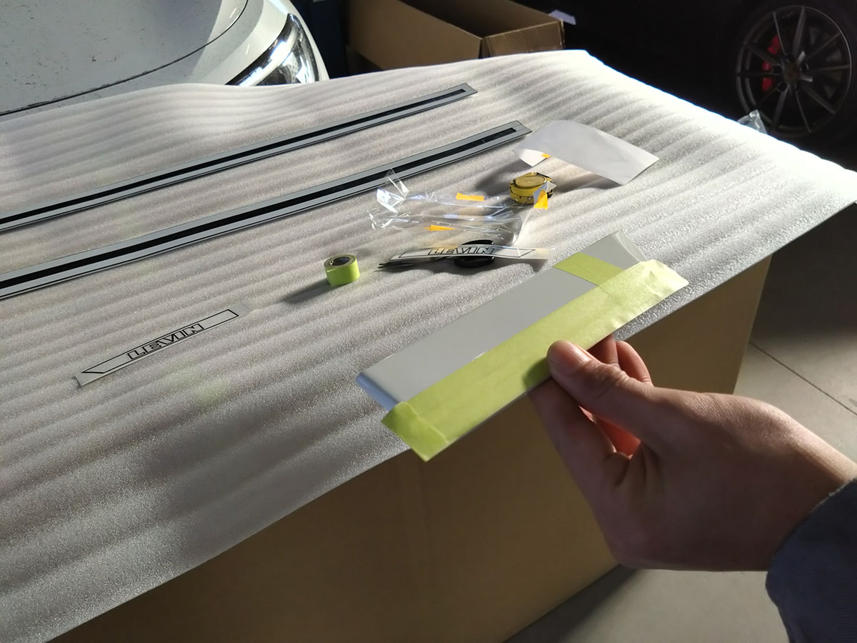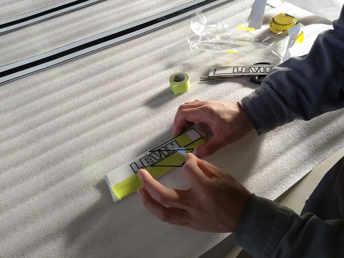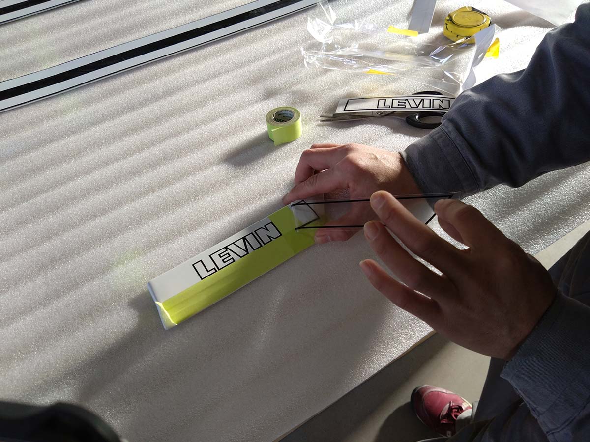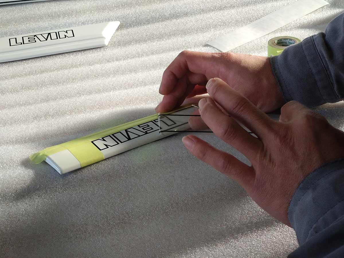 塗装してキレイになったドアモールは、裏面に両面テープが準備済み、表面に「LEVIN」ロゴのステッカーを貼っていきます。