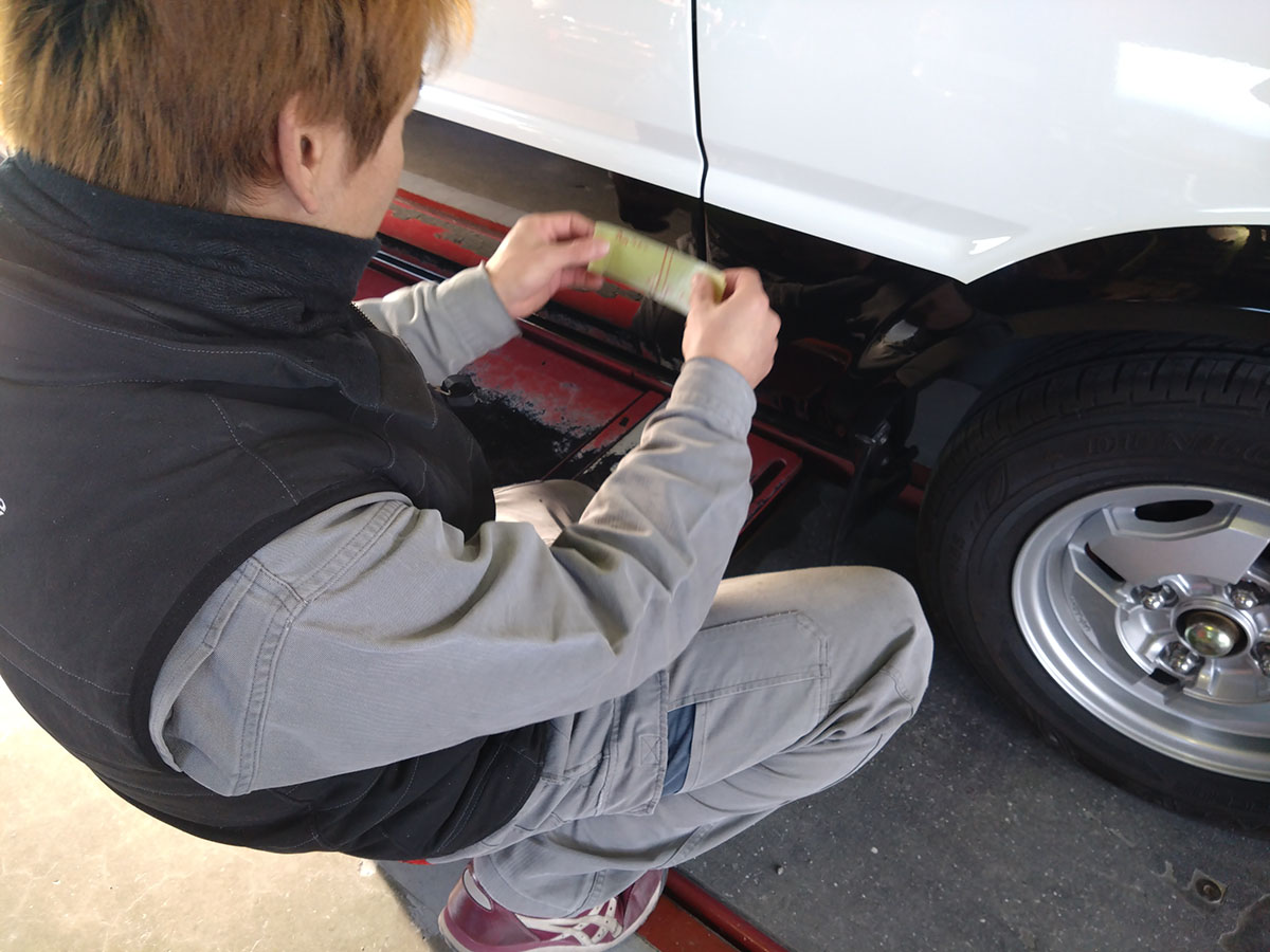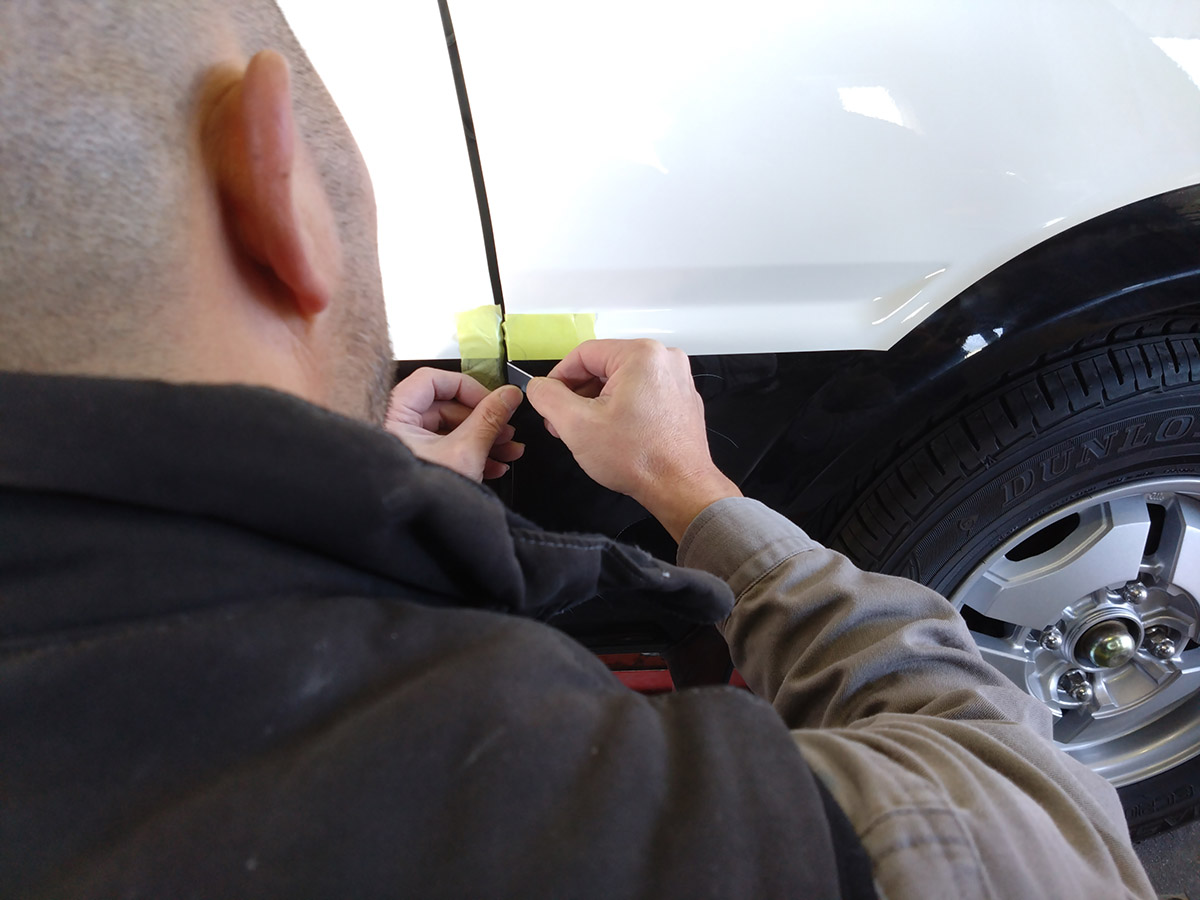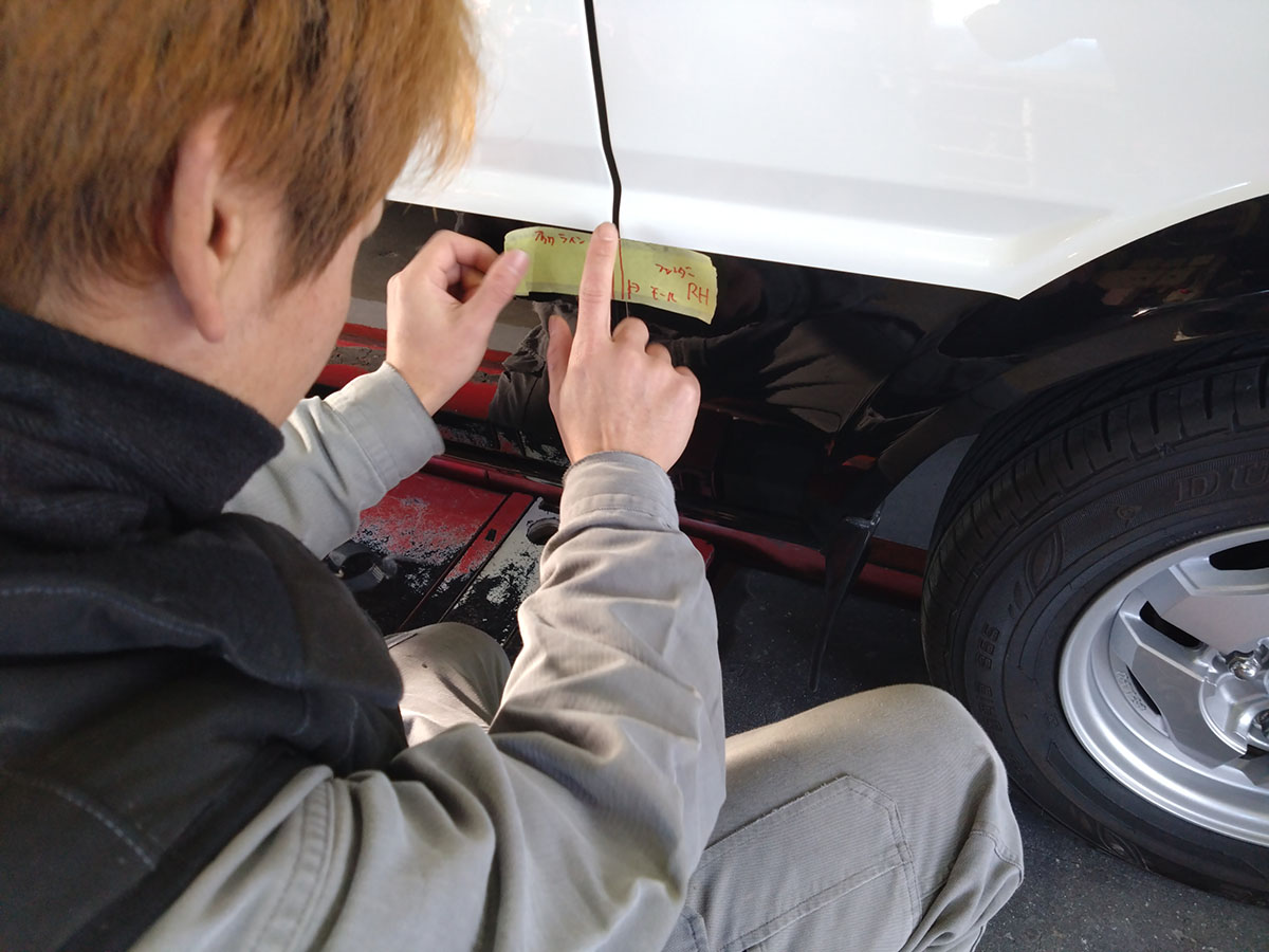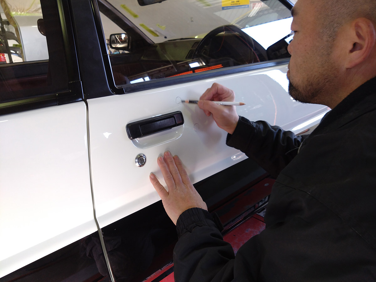 塗装面に異物が付着しているところや塗料がダマになっている部分などをマーキングしていきます。