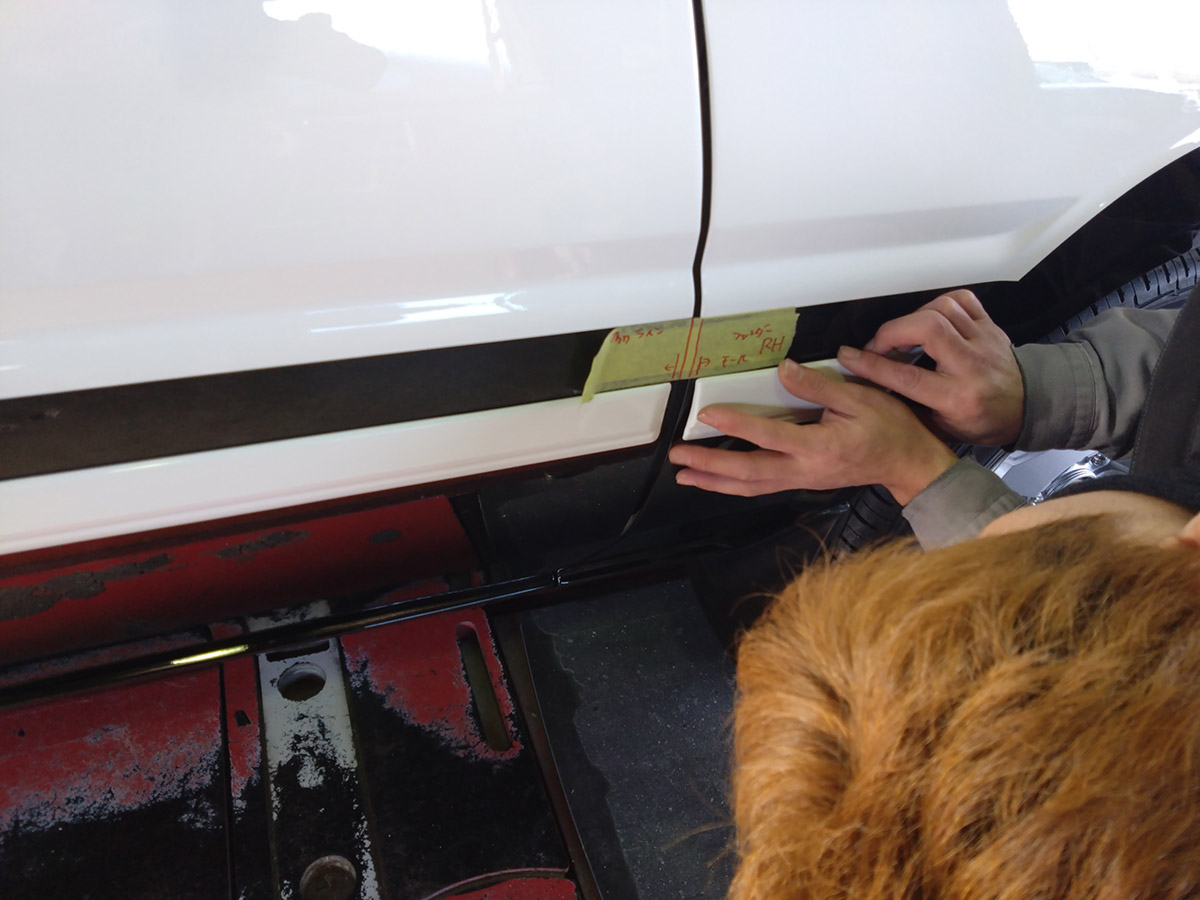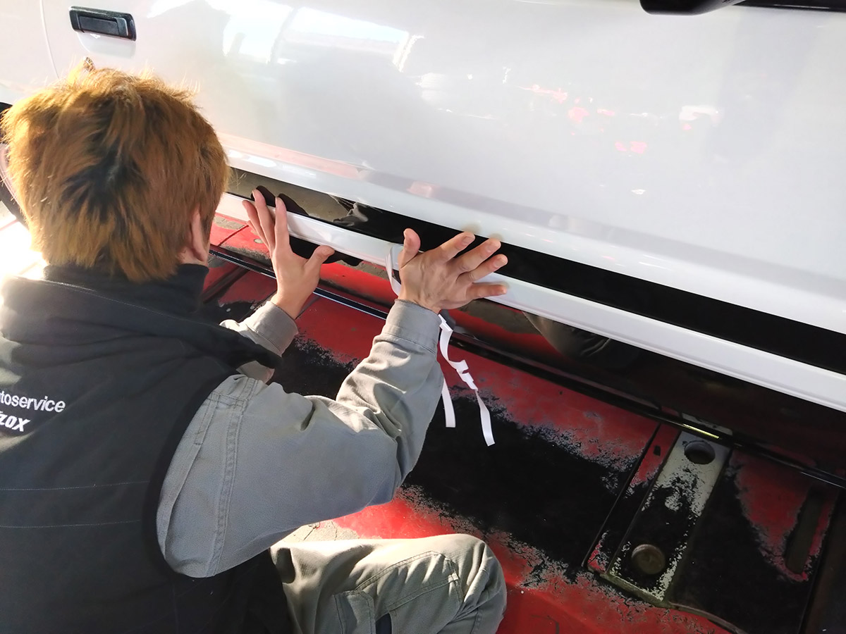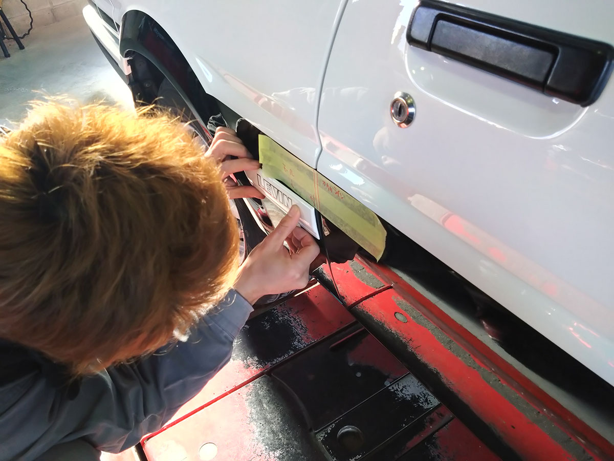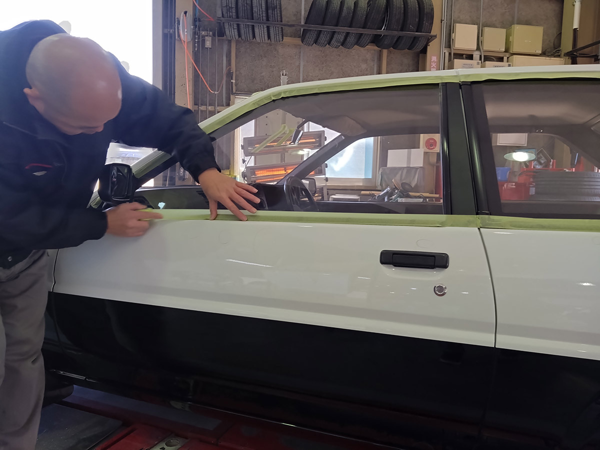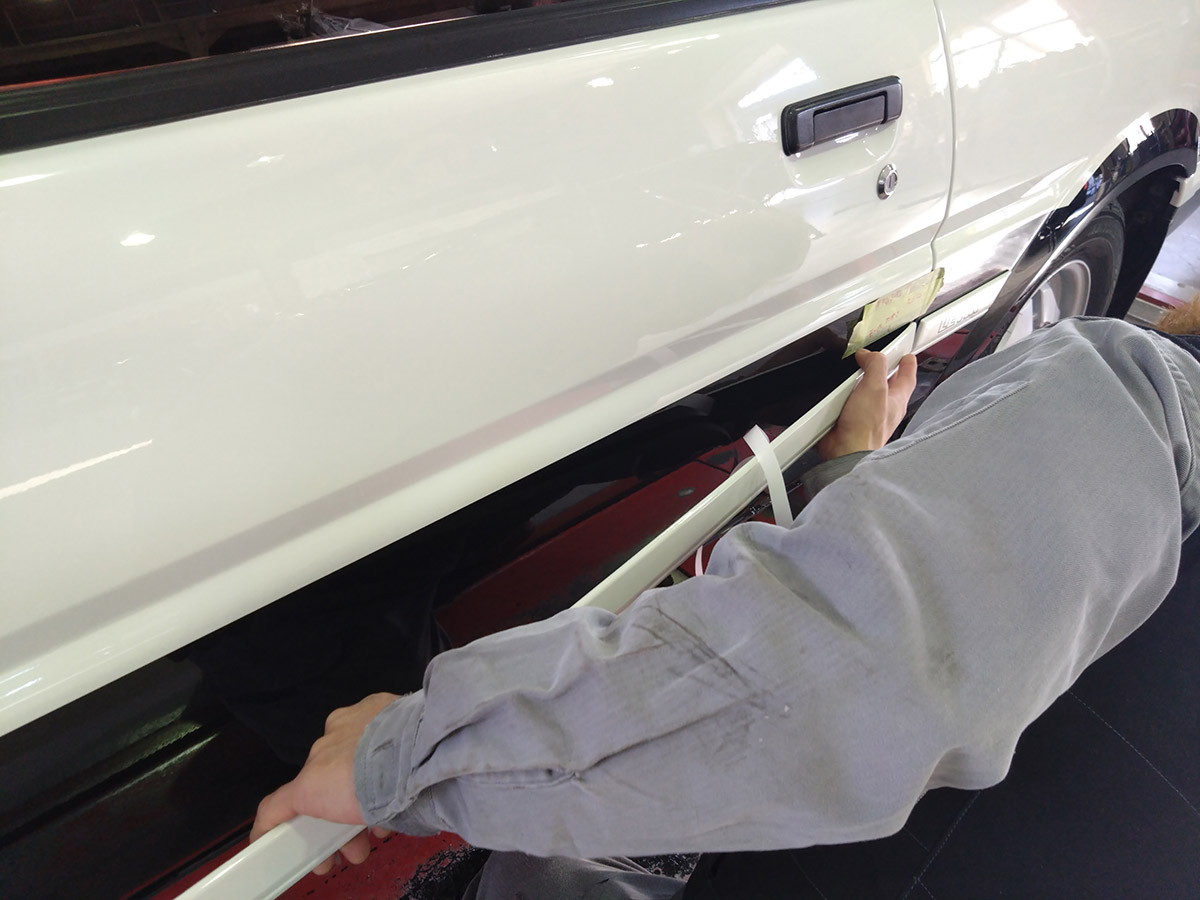 「トヨタ AE86(ハチロク)」の車体にドアモールを取り付けていきます。
