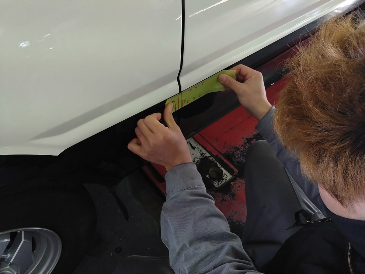 ドアとボディの境目に、マスキングテープの印書きの通りに貼り付けます。
