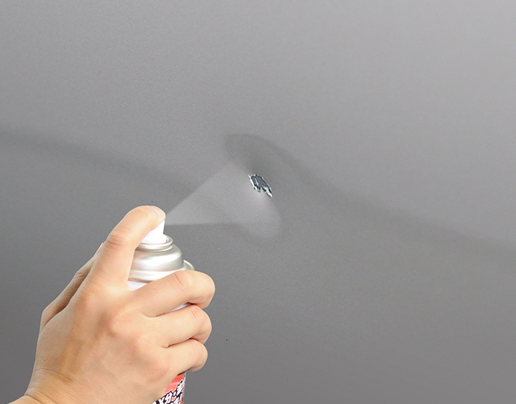 補修する前に車体の汚れを十分落としてから、シリコンオフをスプレーしてキレイなタオルで拭きます。サビなどが発生していたら、耐水サンドペーパーであらかじめサビを除去してください。
