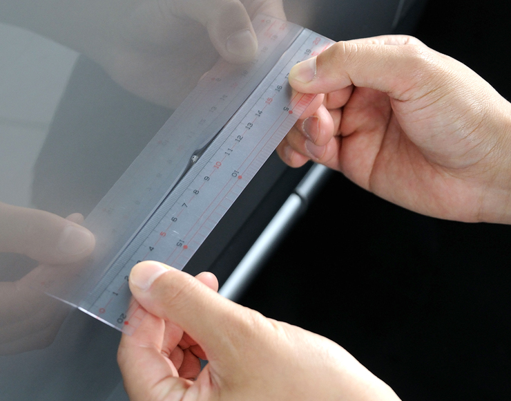 塗装補修する前に車体の汚れを十分落としてから、定規を当ててへこみの範囲をチェックし、その範囲をマーキングしておきます。