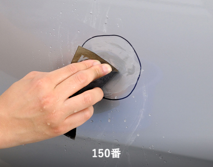 周囲の塗装との境目に段差が残っていると、カラー塗装した時に必ず目立ってしまいます。なめらかになるまで研磨しましょう。