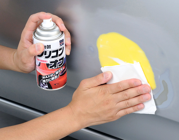 シリコンオフをスプレーしてキレイなタオルで拭きます。