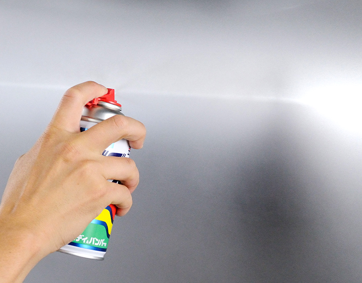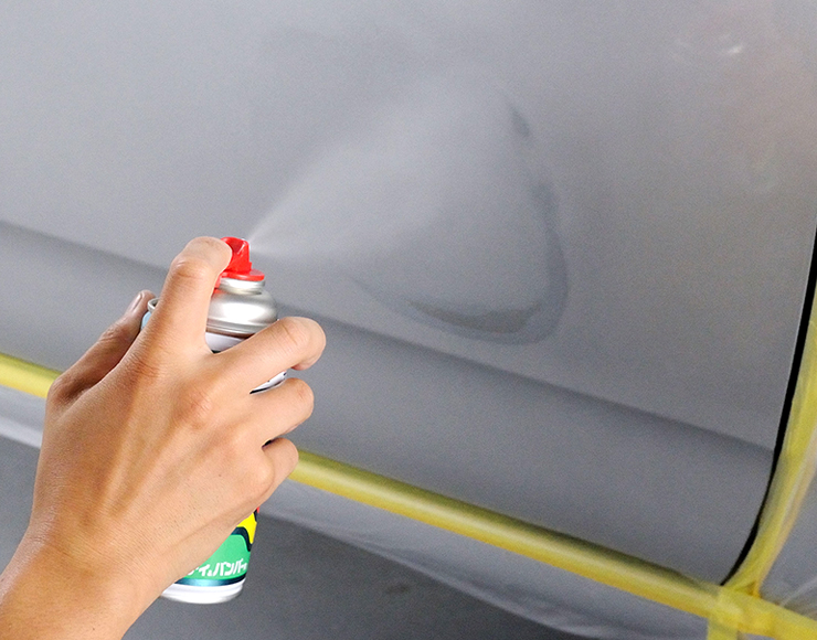 カラーペイントをスプレーする直前に、広い範囲にボデーペンボカシ剤をスプレーしておくことでカラーペイントの塗装時に発生する白っぽいザラつきを効果的に抑えることができます。