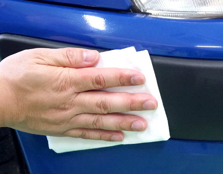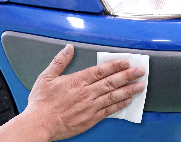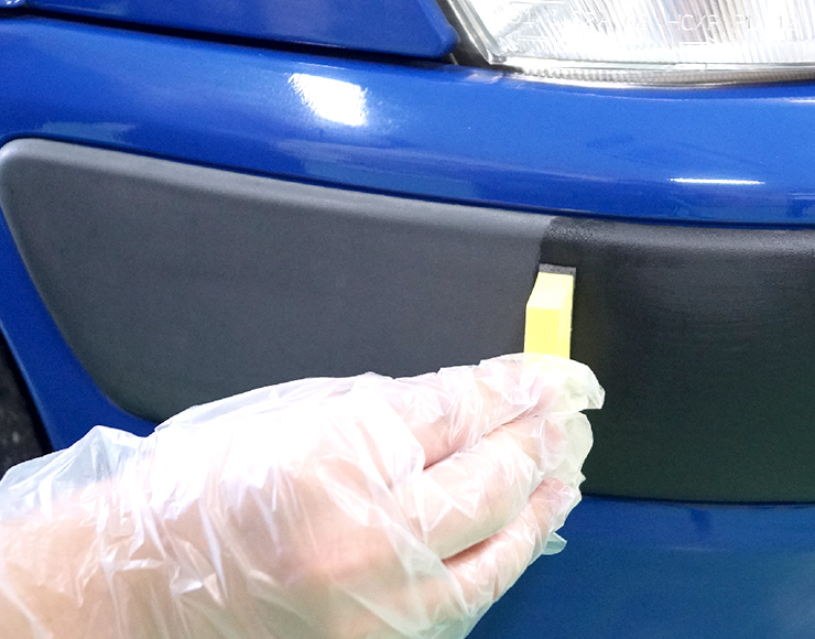 手袋をつけ、専用スポンジを切り離しスポンジの黒い面に光沢復活剤の液を適量染み込ませ、劣化したバンパーの未塗装樹脂部分に薄く均一に塗り広げます。