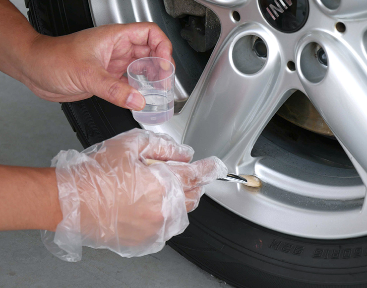 作業前にじゅうぶんにシャンプー洗車してきれいにアルミホイールの汚れを落とし、水滴を拭き取った後、ホイール鉄粉溶解クリーナーの液をカップに適量取り、付属の手袋をつけ、筆でアルミホイールのブレーキダストが固着している箇所にたっぷり塗り付けます。