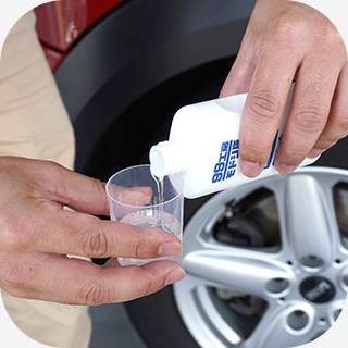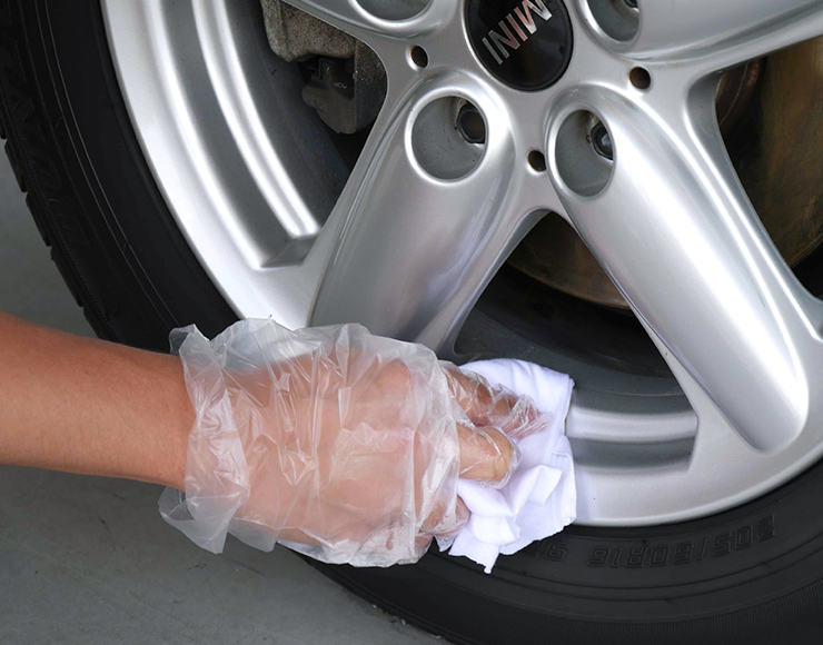 洗車では落とすことができなかった、アルミホイールの塗装表面に食い込むように固着していたブレーキダストを、強酸の力で塗装を傷めることなく溶かし、アルミホイールの輝きを取り戻します。