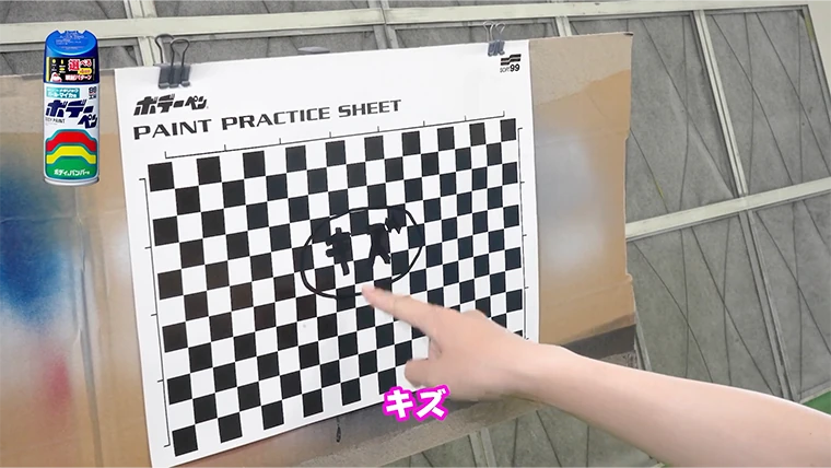 スギオカでは続いてテスト用の塗装シートに切り替えて練習していきたいと思います。油性マーカーでキズの位置を書いておきました。