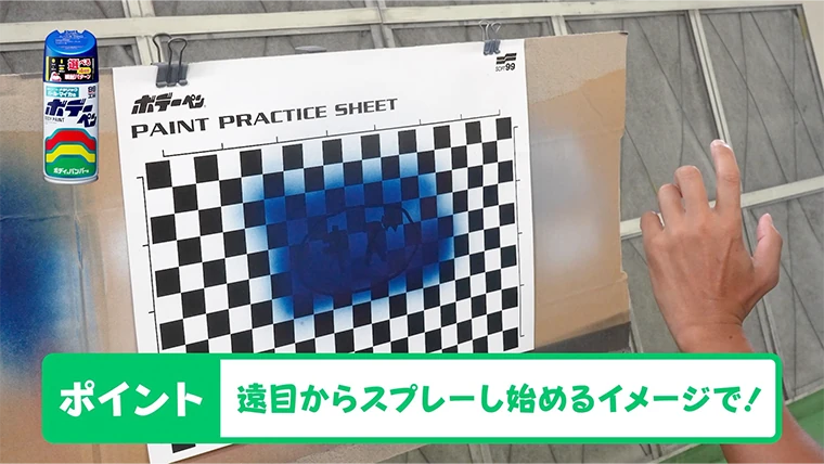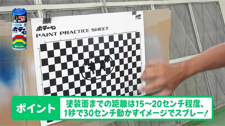 塗装面までの距離は15〜20cm程度、1秒で30cm動かすイメージでスプレー!