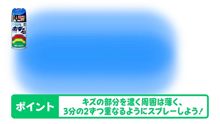 キズの部分を濃く周囲は薄く、3分の2ずつ重なるようにスプレーしよう!