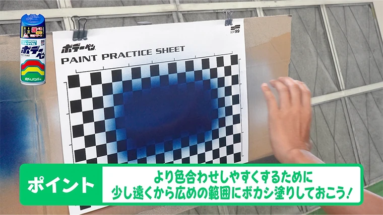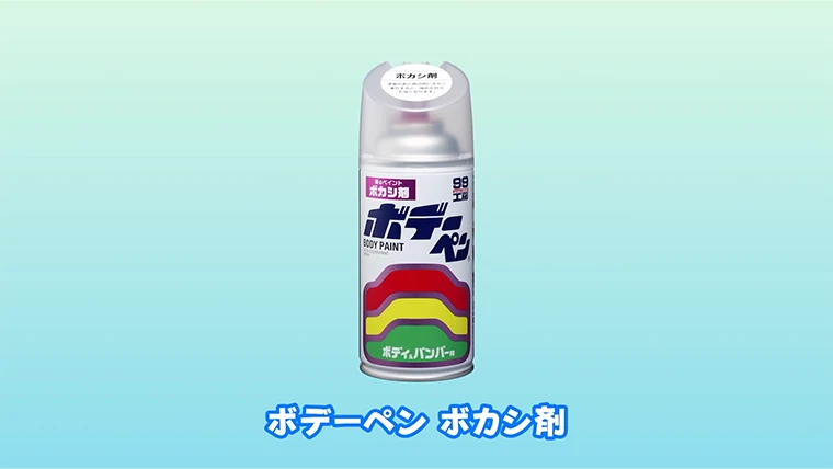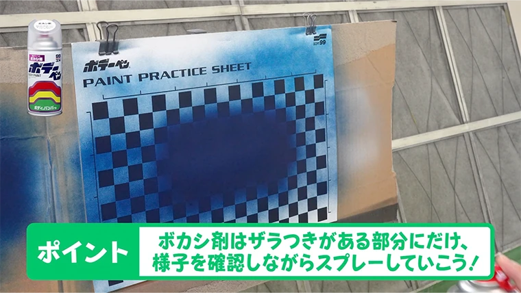 スギオカ塗装の周辺のボカした部分はツブツブと塗料がついている状態ですが、これらが乾燥するとザラザラに残ってツヤのない状態で固まってしまうんです。『ボデーペン ボカシ剤』はそれらを溶かして平滑にすることで、元の塗装と馴染む効果を持たせるスプレーです。まずはカラーでボカシ塗装をしてから『ボデーペン ボカシ剤』をかけるようにします。